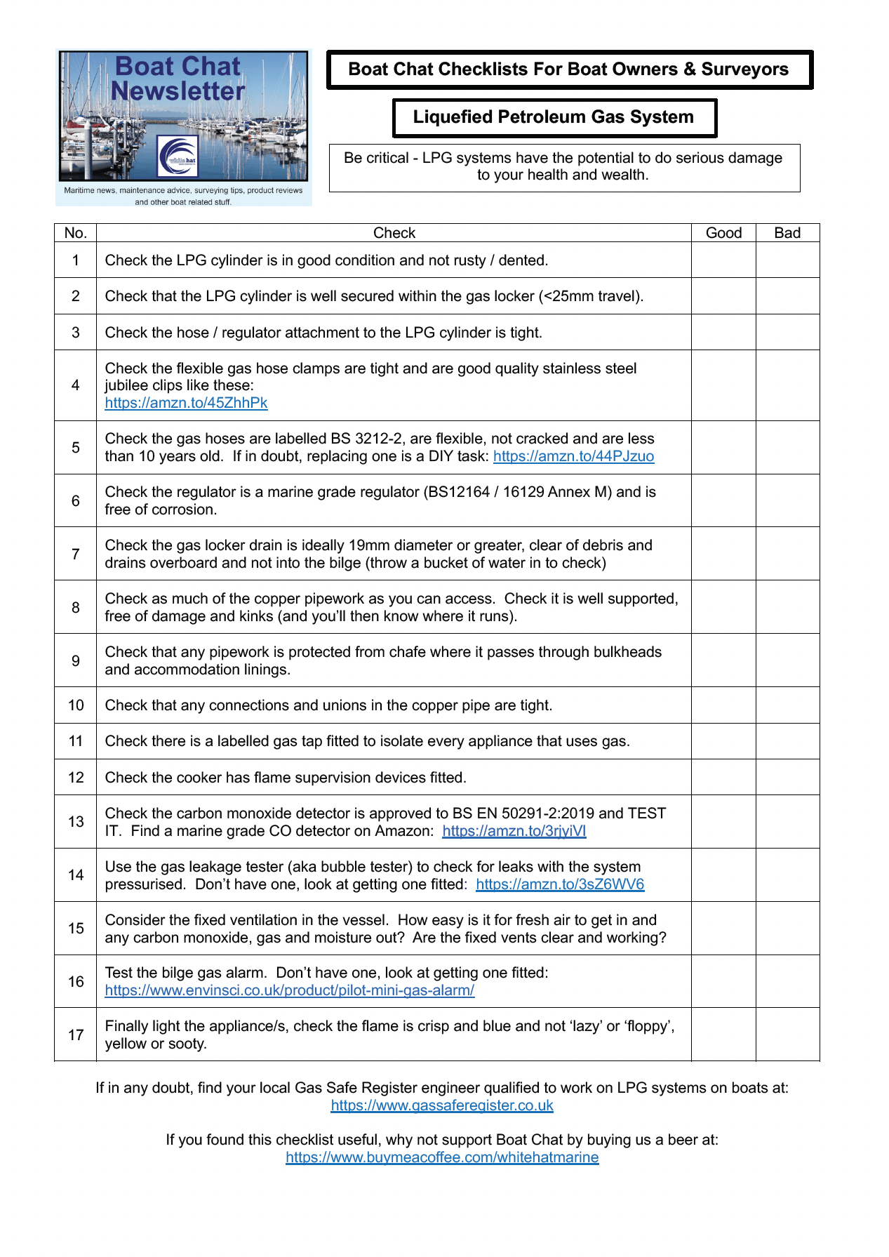 Check the gas locker drain is ideally 19mm diameter or greater, clear of debris and drains overboard and not into the bilge (throw a bucket of water in to check).